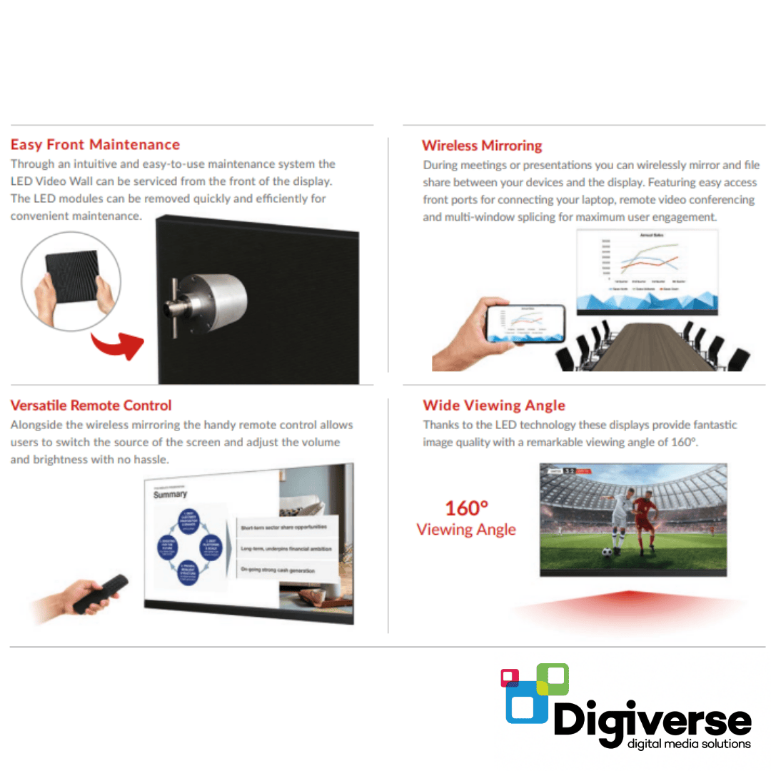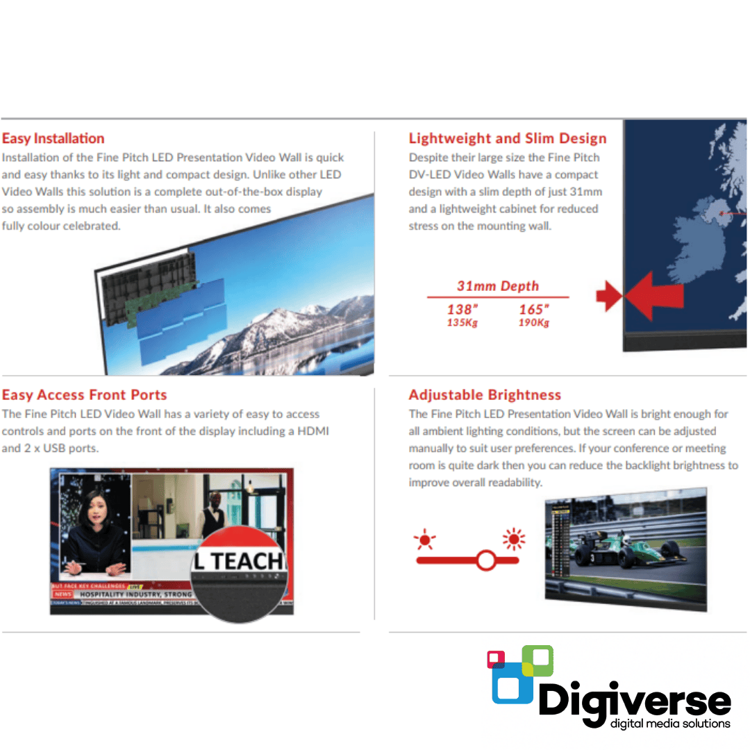 The 165″ Fine Pitch LED Presentation Video Wall is a cutting-edge display solution designed for organisations that demand the very best in clarity, scale, and impact. With its ultra-fine pixel pitch and seamless LED panels, it delivers sharp, vivid images with incredible detail, making it ideal for boardrooms, auditoriums, exhibition halls, and corporate lobbies.