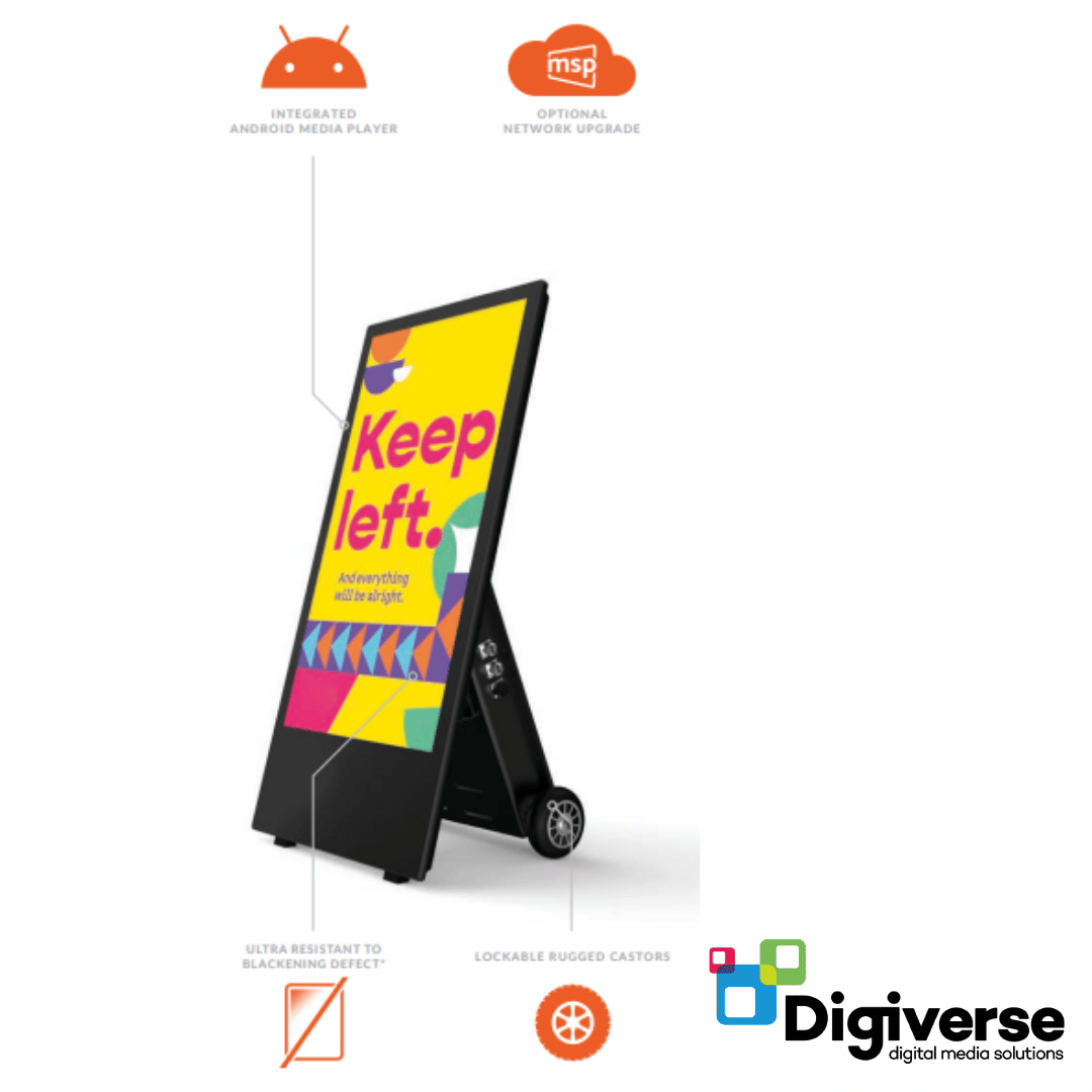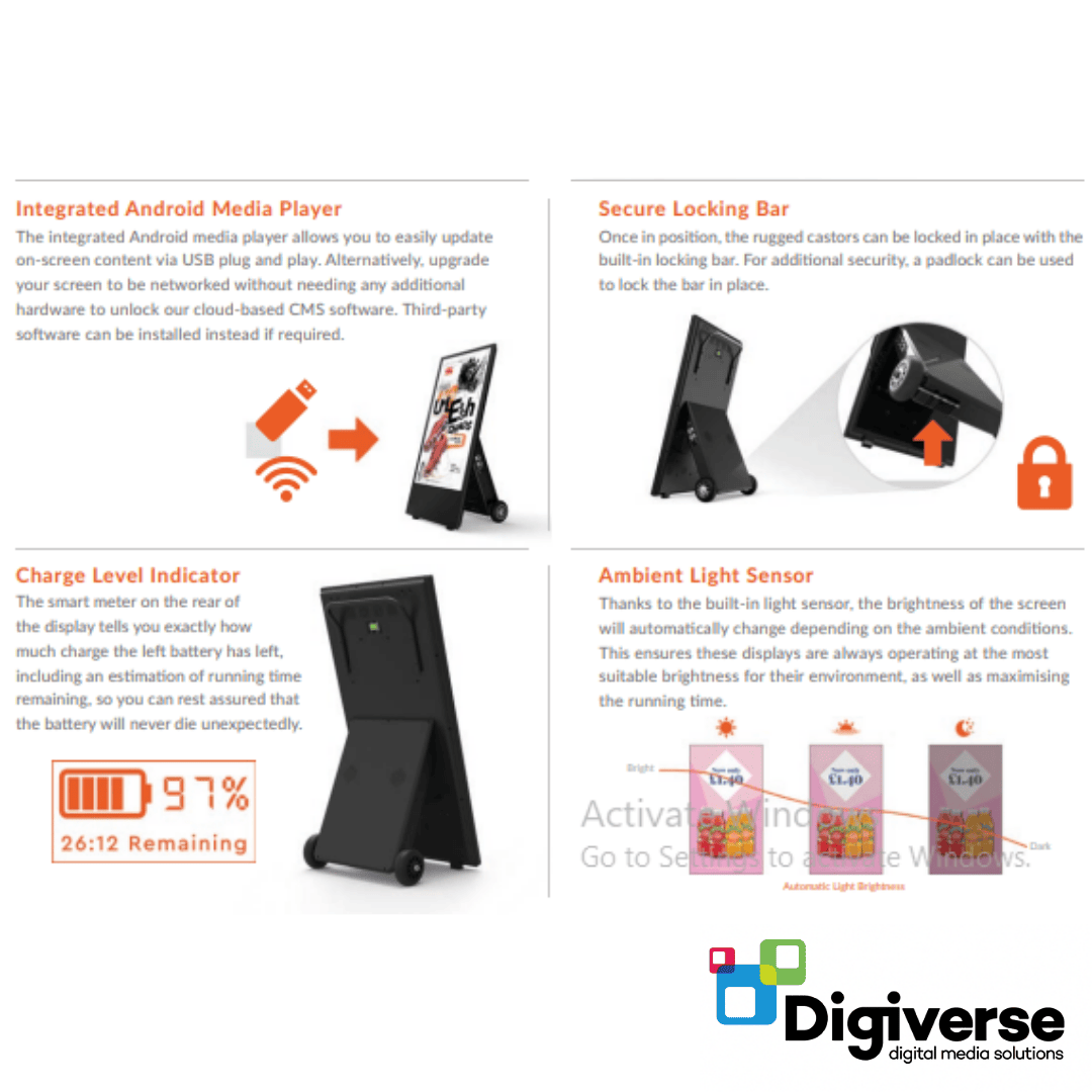 Powered by a rechargeable battery, it delivers up to 27 hours of continuous operation per charge. An integrated Android 14 OS operating system allows for easy plug-and-play USB content updates, with an optional network upgrade for remote management. Heavy-duty lockable castors make relocation simple, ideal for retail forecourts, outdoor events, and pop-up promotions.