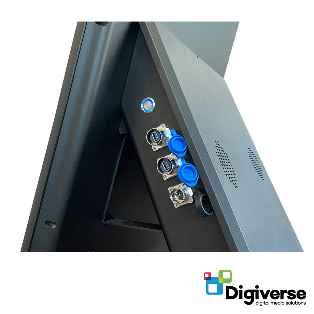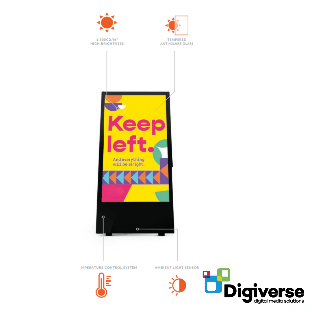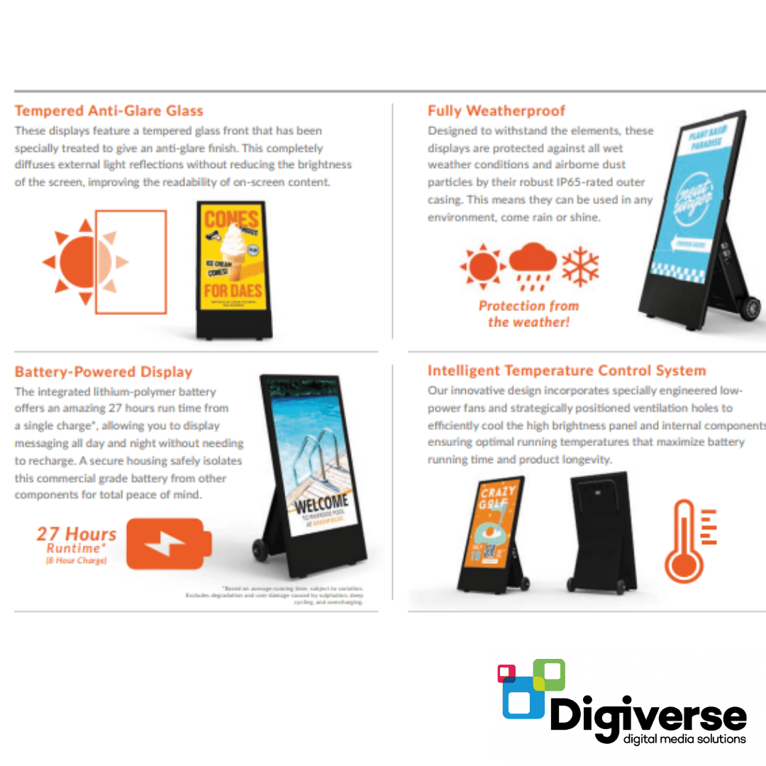 The 43″ High Brightness Outdoor Digital Battery A-Board is a mobile, all-weather signage solution designed for visibility in bright outdoor settings. With 1,500 cd/m² brightness, content remains vivid even in direct sunlight, while the IP65-rated enclosure ensures protection against dust, rain, and environmental elements.