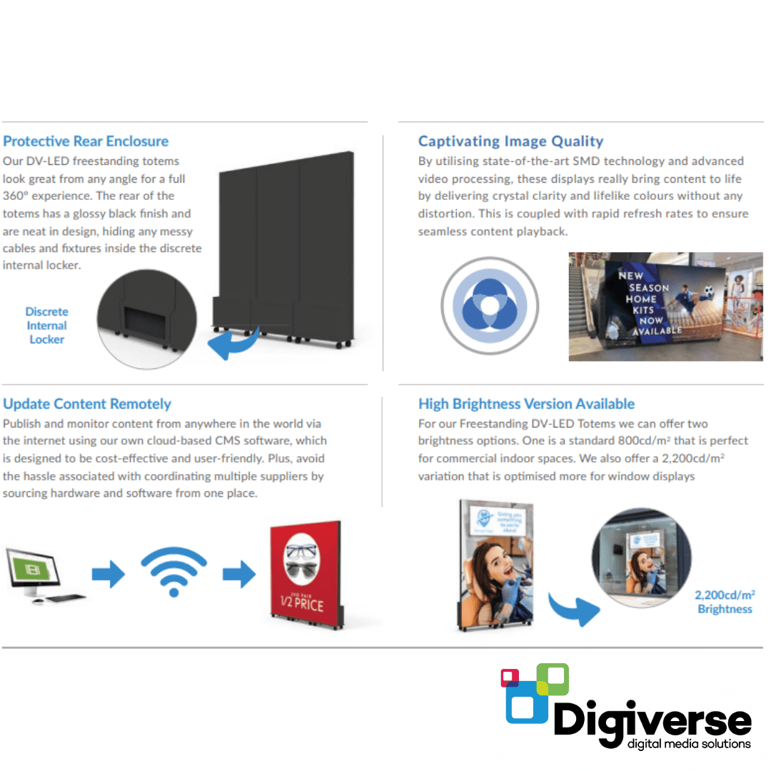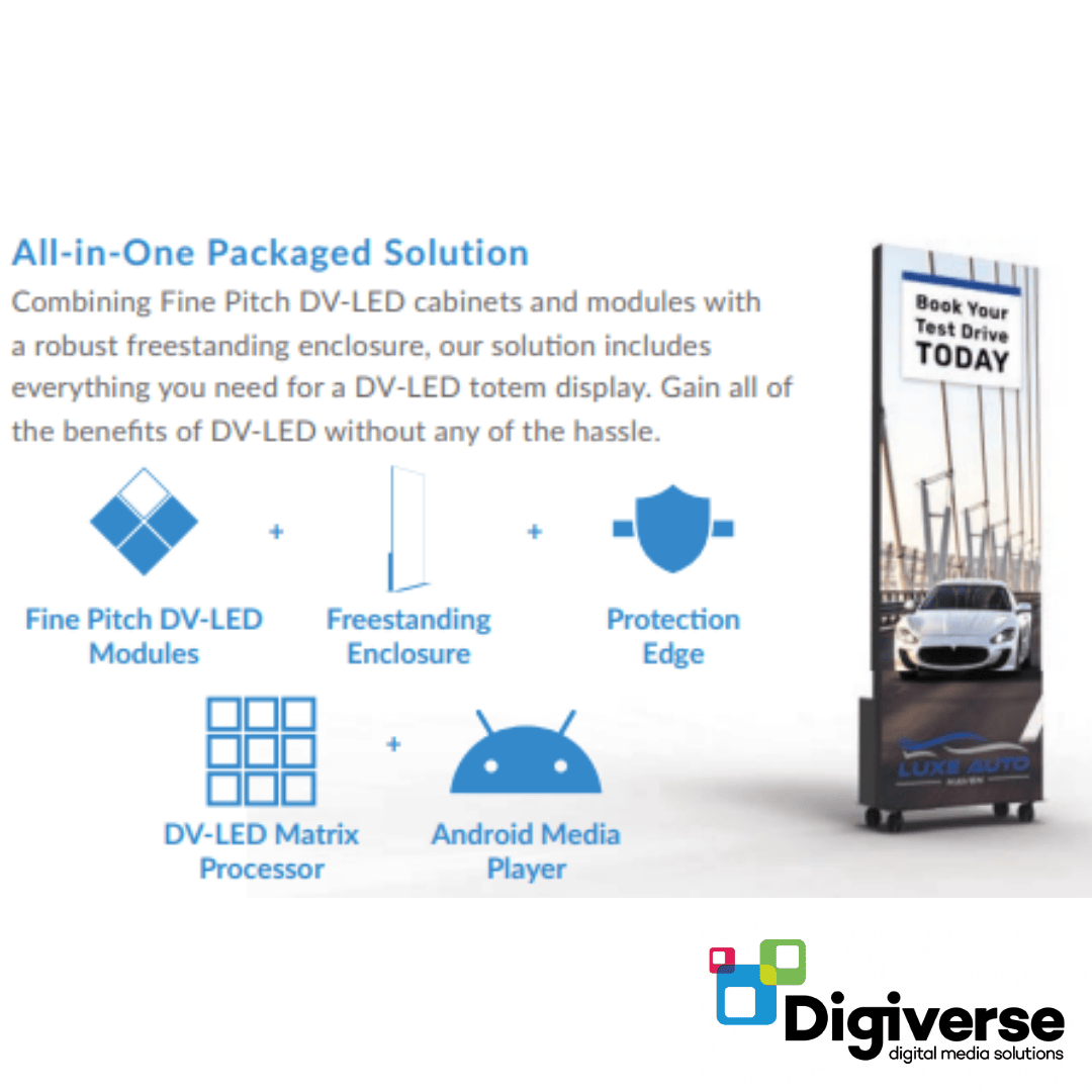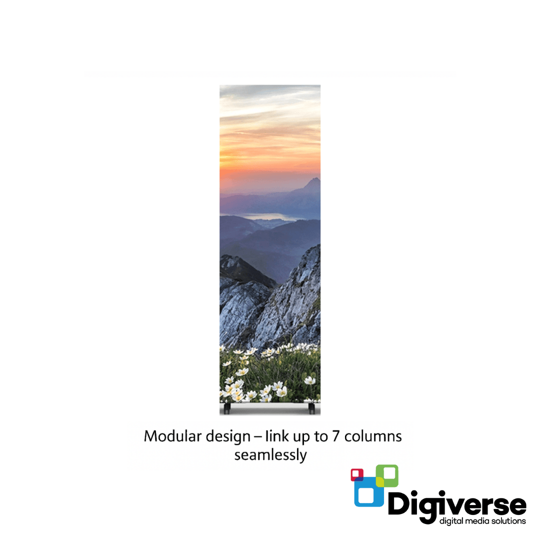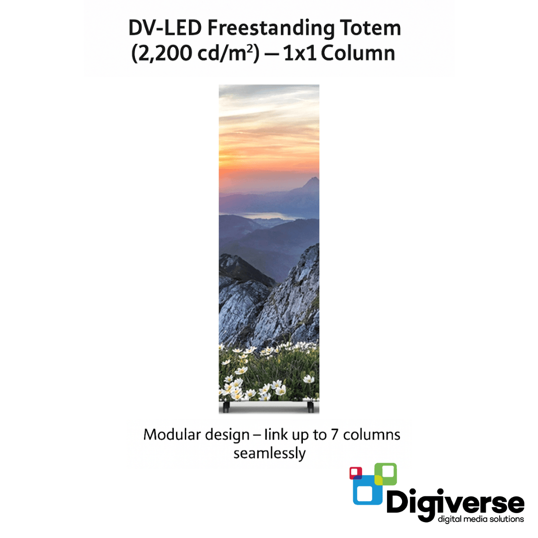 The High Brightness DV-LED Freestanding Totem (1×1) delivers powerful 2,200 cd/m² brightness, ensuring vivid and clear visuals even in environments with intense ambient light, such as sunlit atriums or near windows.