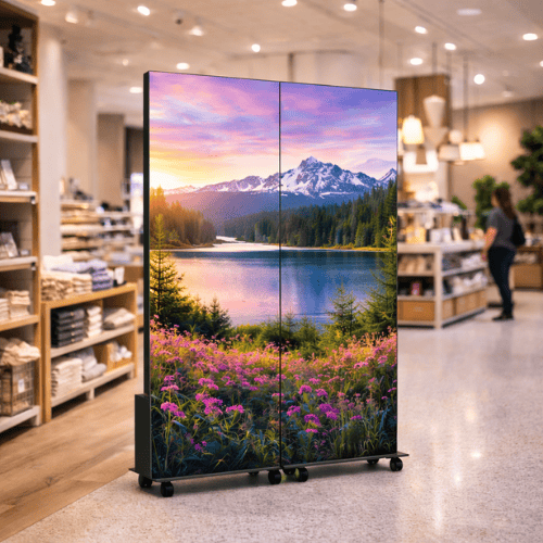 The 2×1 GOB P1.8 DV-LED Freestanding Totem expands horizontally to provide a more immersive LED display while maintaining a sleek vertical form. Its P1.8 fine-pitch LED modules deliver crisp text, detailed graphics, and smooth video, while the GOB sealant layer protects against knocks, scratches, and environmental contaminants. Perfect for retail displays, hospitality, exhibitions, and transport hubs, this model balances width and height for versatile, durable, high-quality indoor signage.