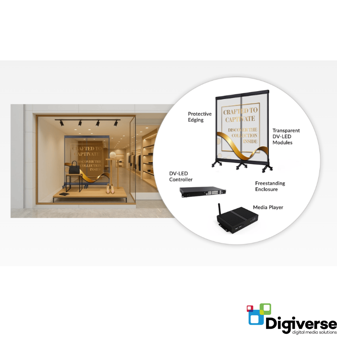 NEW Indoor Transparent DV-LED Freestanding Totems — striking see-through LED signage that blends digital content with real-world visibility. Available to Pre-Order.